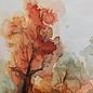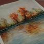 A watercolour painting that captures the beauty and colourfulness of autumn in a unique way. The painting shows a lake in the middle of an autumnal landscape, with trees in the background and a clear sky. The warm colours and smooth transitions give the painting a calming atmosphere. Painted in October 2022